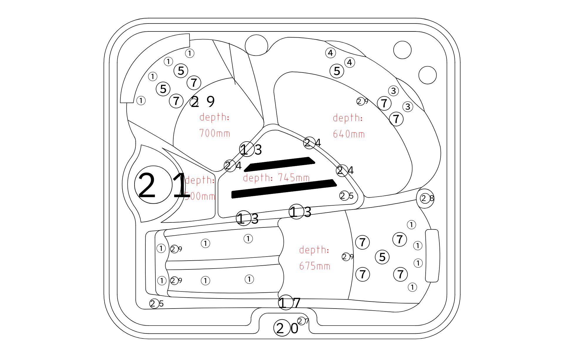 • 1. låge: styring til spa, styring til varmeblæser, vandpåfyldnings-styring samt el-tilslutning af styring til spa