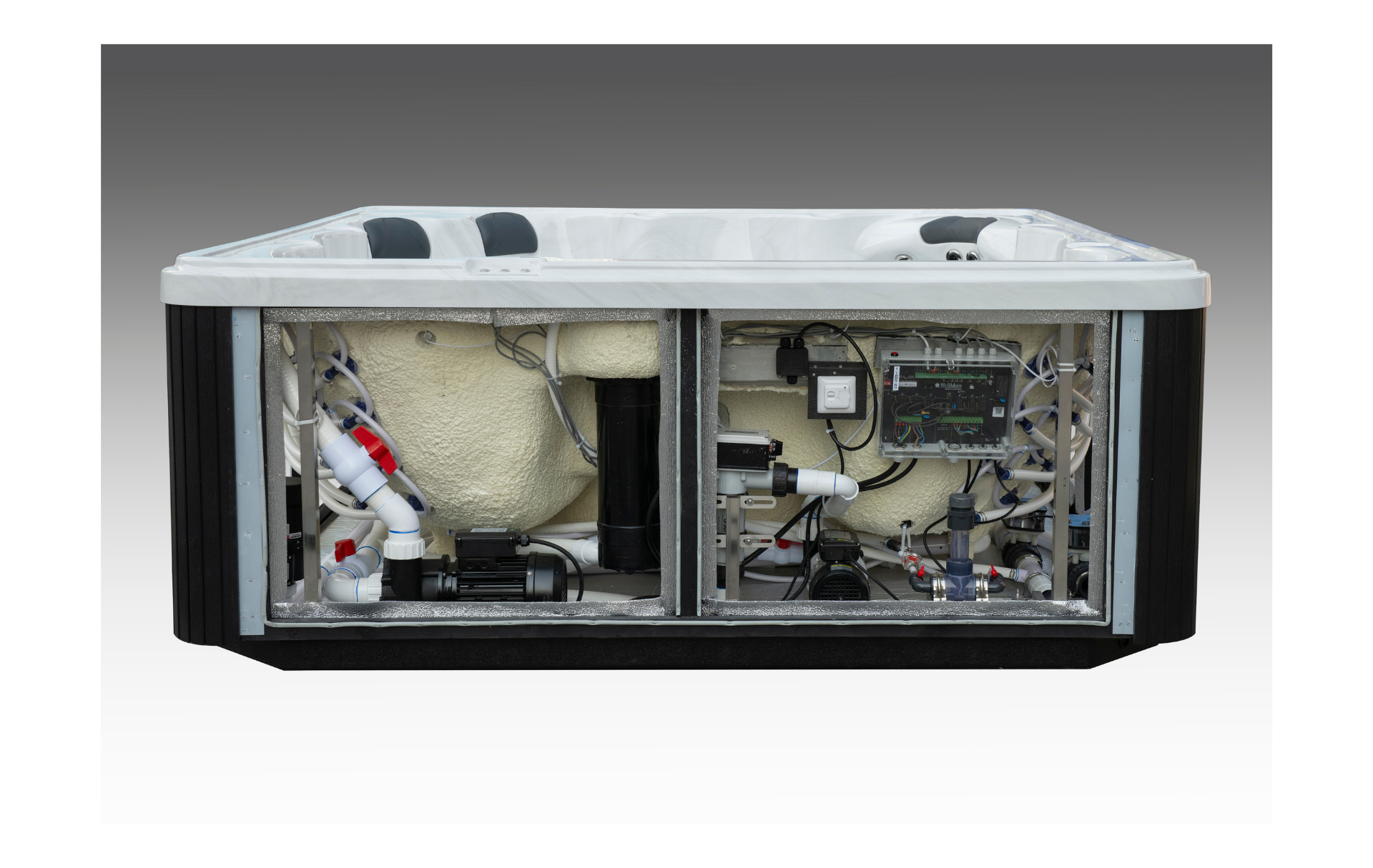• Al teknik er gemt (på én side) bag aflåst kabinet. – Adgang til styring af spa, ekstern frostsikring, vandpåfyldningsstyrring, el-tilslutninger, klorinator m.v.