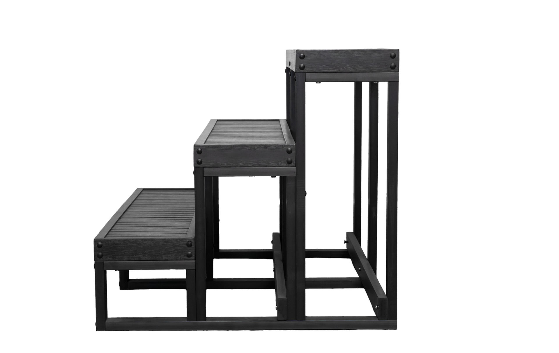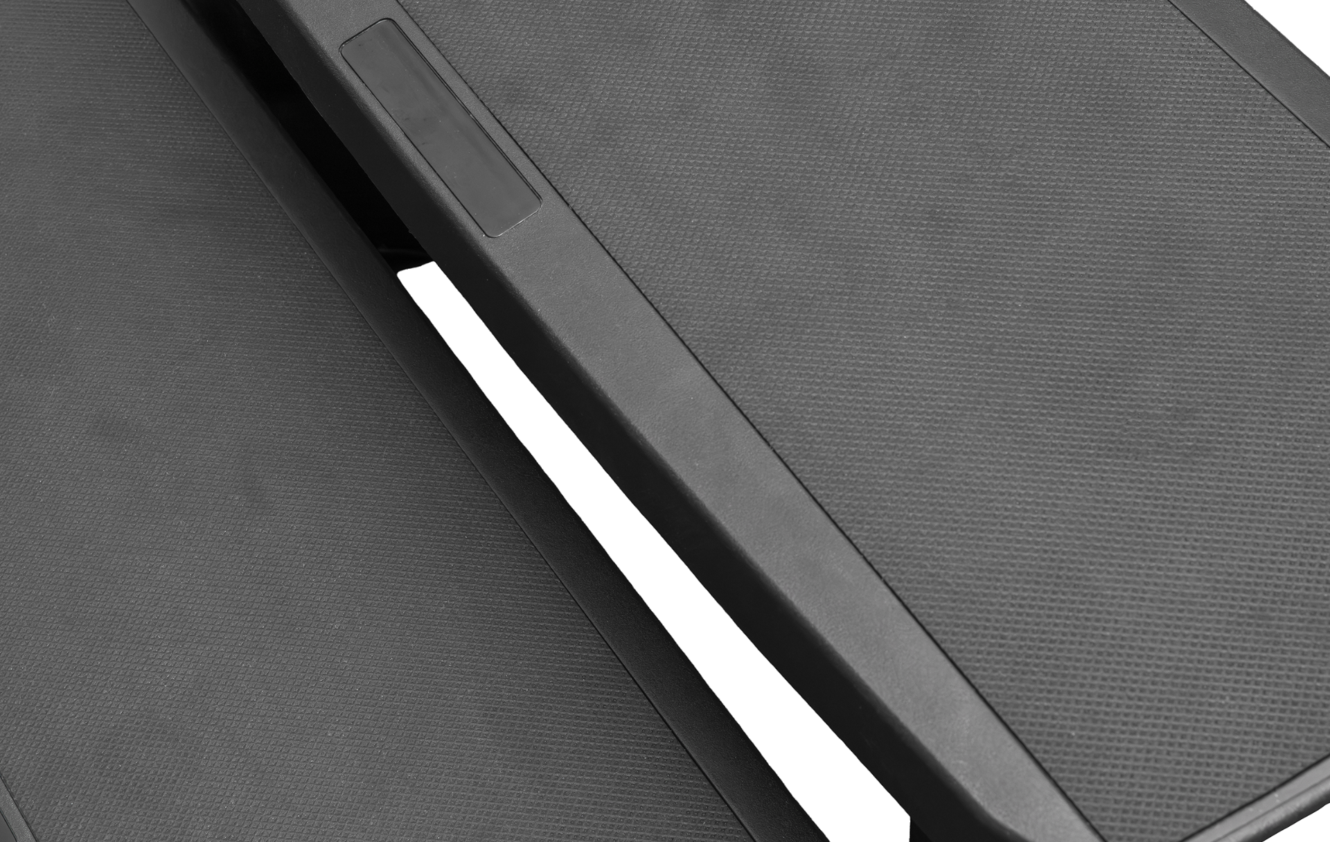 De brede trin i den sorte 2-trins trappe er udstyret med indstøbt skridsikring, som giver et fast og sikkert fodfæste – også når overfladen er våd.